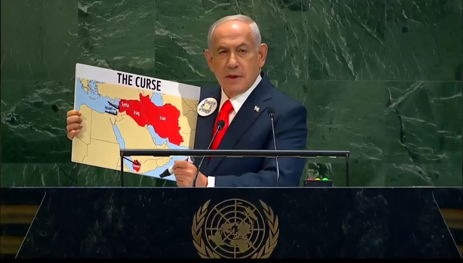 बेंजामिन नेतन्याहू ने UN में घोषणा किया कि, इज़राइली खुफिया एजेंसियों के बदौलत यह भाषण अब गाजा के हर मोबाइल पर लाइव दिखाई दे रहा है और नेतन्याहू ने नक़्शे को हाथ में दिखते हुए कहा अपने हथियार डाल दो, सभी 48 बंधकों को रिहा करो। यदि तुम ऐसा करोगे, तो तुम ज़िंदा बच जाओगे। अगर तुम ऐसा नहीं करोगे, तो इज़राइल तुम्हें ढूंढ निकालेगा और ख़त्म कर देगा जैसे हमने इन-इन लोगों को ख़त्म किया है।