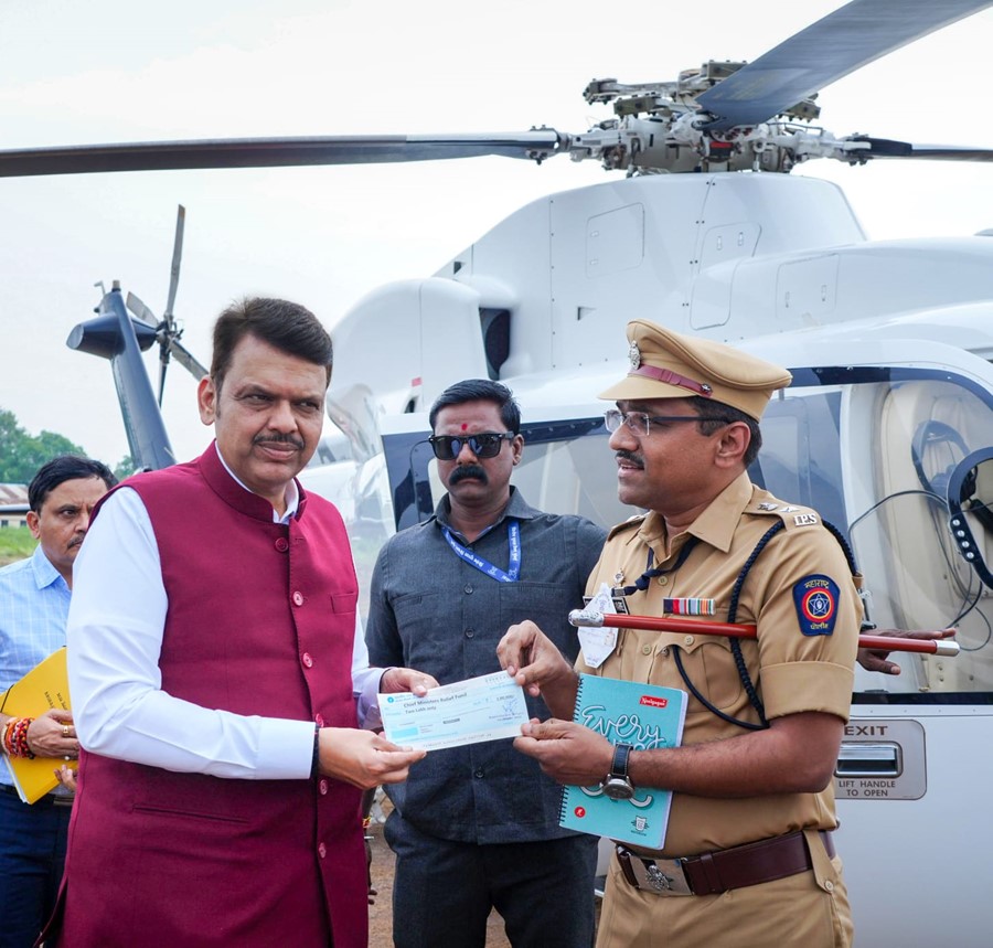 महाराष्ट्र में बाढ़ के त्रासदी से उबारने के लिए पिछले दिनों राज्य के उप - मुख्यमंत्री एकनाथ शिंदे ने पढ़ पीड़ितों के लिए सभी से सहायता करने के लिए निवेदन किया था जिसमे खासकर किसानो का बहुत बढ़ा नुकसान हुआ है इसको ध्यान में रखते हुए धुले जिले के विविध पुलिस अधिकारी एवं कर्मचारी ने अपने वेतन से कुछ रकम निकाल कर धुले जिले के दौरे पर आए महाराष्ट्र के मुख्यमंत्री देवेंद्र फडणवीस का स्वागत करते हुए 2 लाख का चेक दिया जिसकी मुख्यमंत्री ने पुलिस विभाग के सभी कर्मचारियों का भूरी -भूरी प्रशंसा किया।